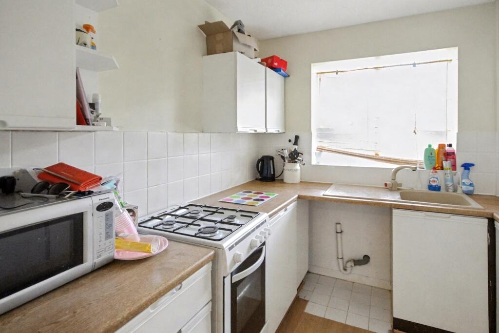 kitchen with white base and wall mounted units. A new cooker has been installed with gas hob and gas cooker. Space for washing machine and fridge freezer.
