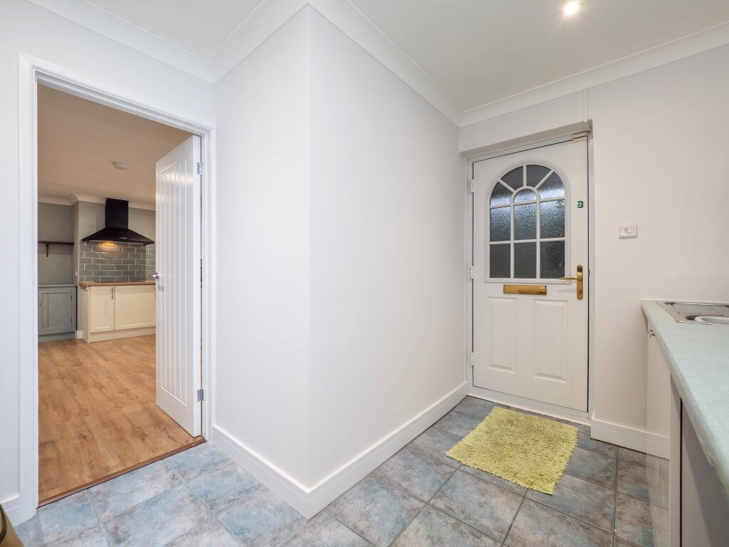 UTILITY ROOM- 9’11 x 8’7 max, 5’7 min (3.02m x 2.63m max, 1.72m min)Roll top work surface with tiled splashbacks and cupboard under, inset single drainer stainless steel sink unit, plumbing for washing machine, tiled effect flooring, radiator, UPVC double glazed window to the side aspect, coved and textured ceiling, part-glazed door to side.