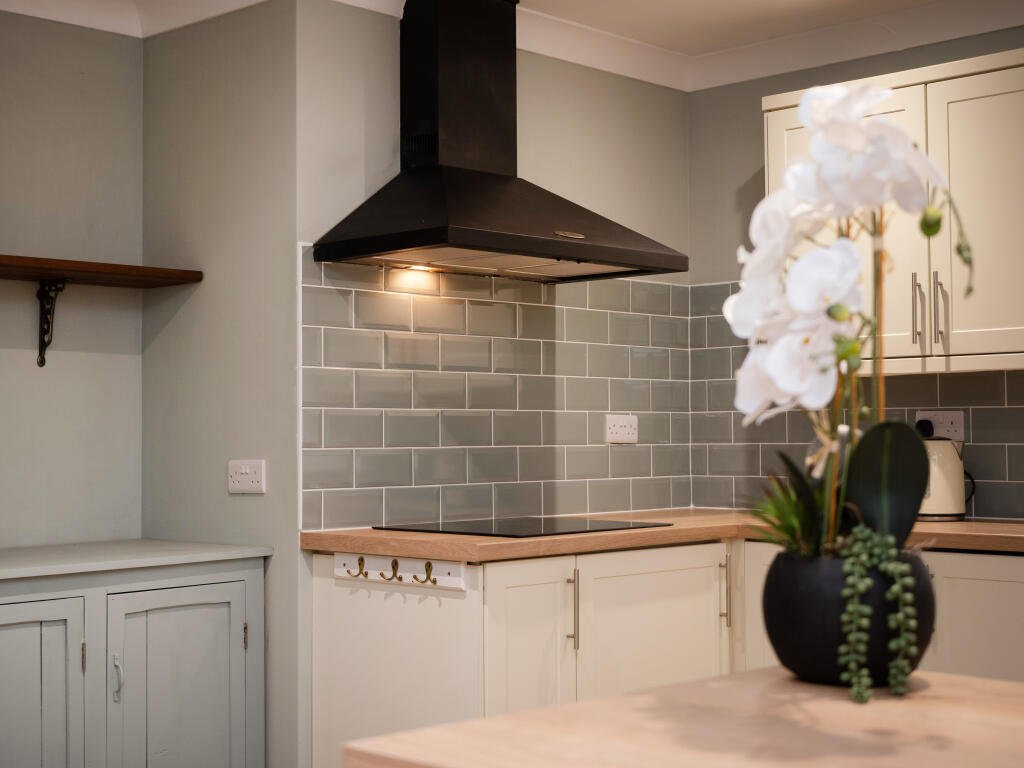 KITCHEN- 17’7 max, 15’4 min x 9’11 (5.36m max, 4.67m min x 3.03m). Open space flows into the kitchen with UPVC sealed window to the side aspect, a range of fitted base and wall mounted units, roll top work surfaces with tiled splashbacks, inset electric hob with extractor over, integrated hob and grill, inset sink with mixer tap over, wood effect flooring and breakfast bar into the dining area.