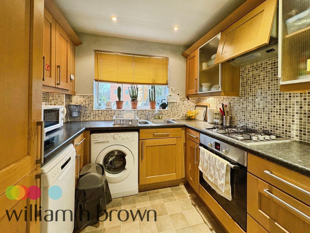 Kitchen – 7′ x 8′ 2″ (2.13m x 2.49m) Front aspect double glazed window, fitted with a range of base and eye level units and work surfaces incorporating a one and a half stainless steel sink with mixer tap. Appliances include an integrated oven with four ring gas hob and extractor fan, integrated fridge/freezer, slim line dishwasher and washer/dryer.