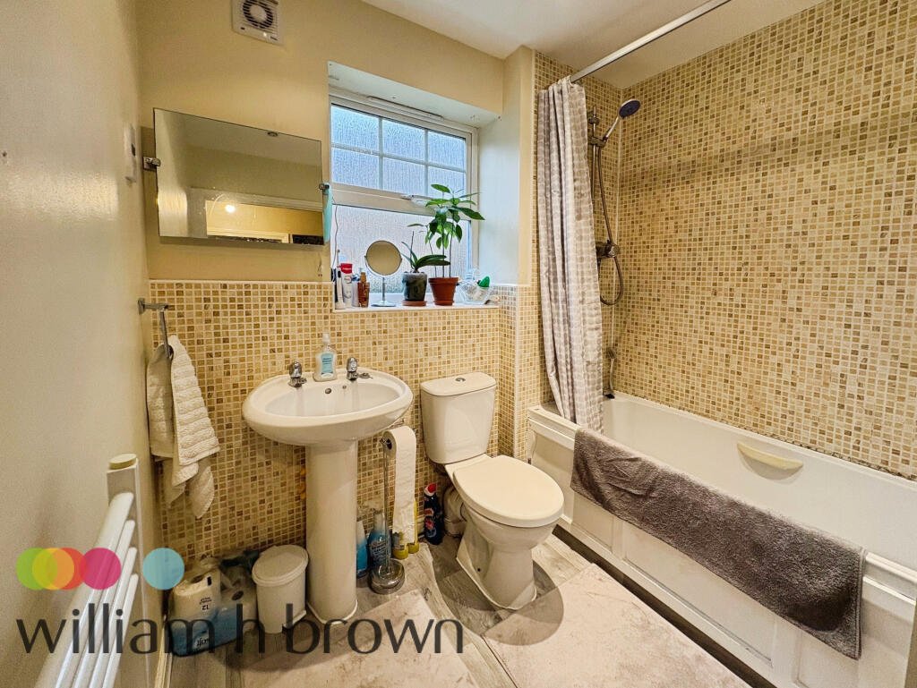 Bathroom Obscure side aspect double glazed window, bath with overhead shower, low level WC, pedestal wash basin and heated towel rail.