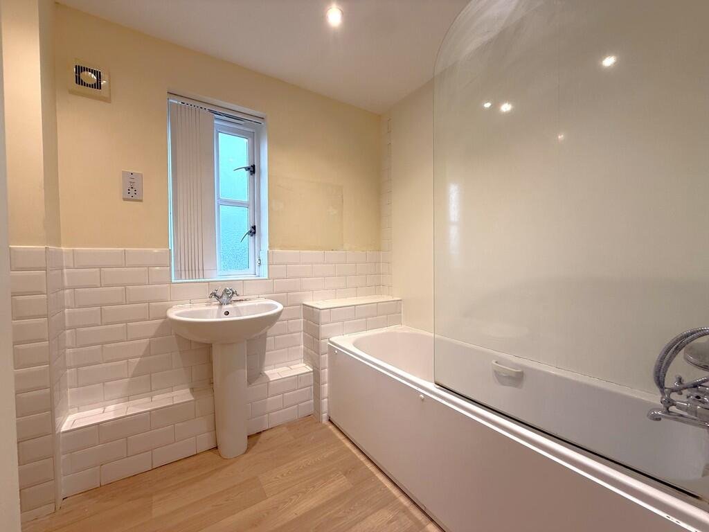 FAMILY BATHROOM 9′ 4″ x 7′ 6″ (2.86m x 2.29m) A neutral theme bathroom with vinyl flooring, a double glazed smoked glass window and fitted spotlights.