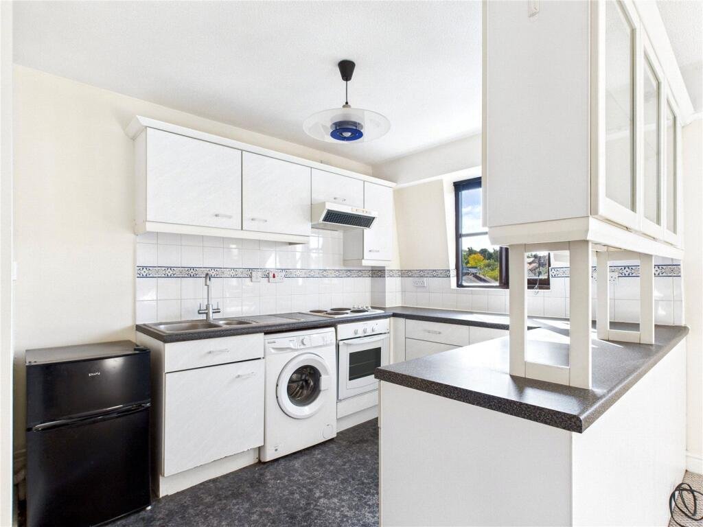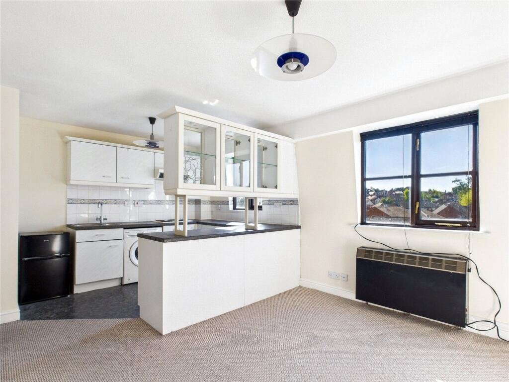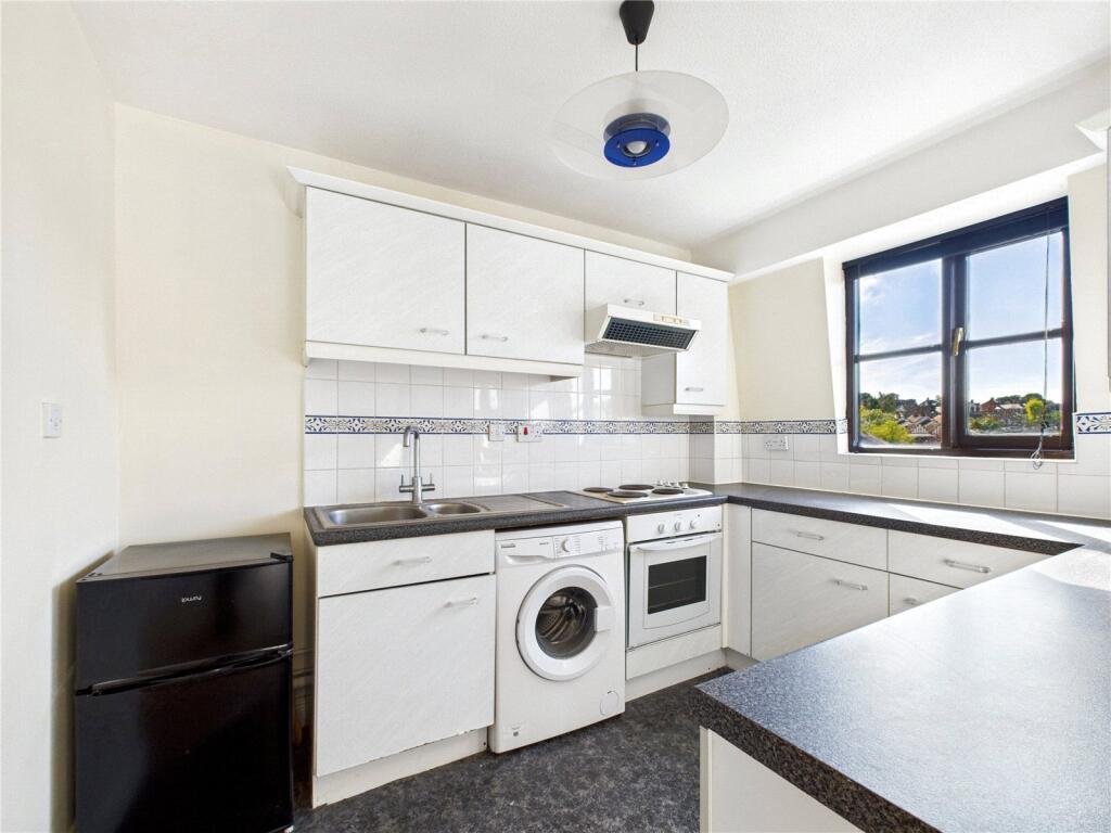 The kitchen/living area is set to the front of the apartment with two double glazed windows to the front aspect and an electric storage heater. The kitchen has a range of matching base and wall mounted units, rolled edge work surfaces, inset one and a half bowl stainless steel sink with mixer tap, part tiled walls, built in electric oven