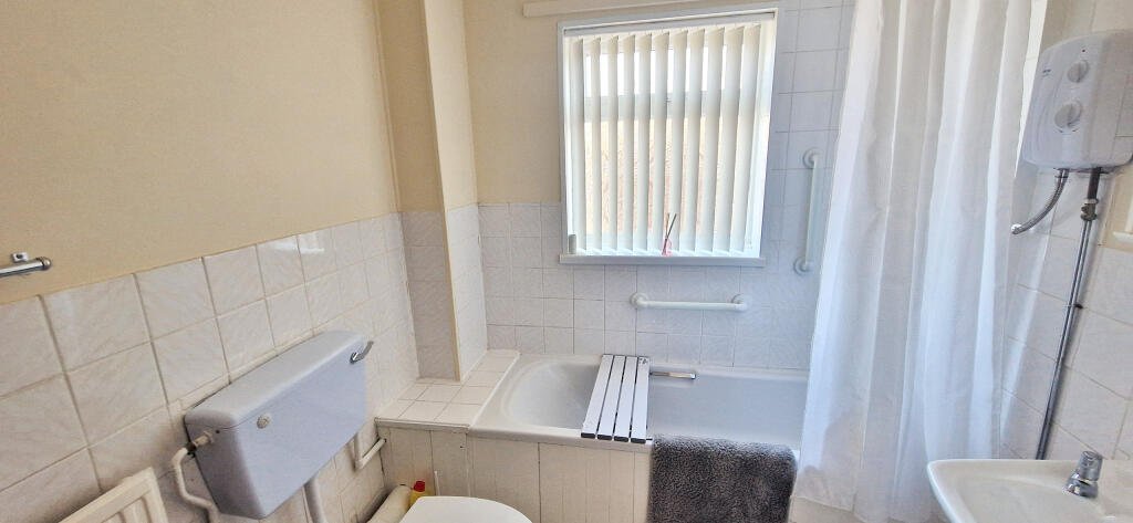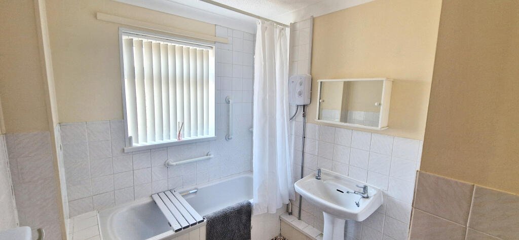 The bathroom is conveniently positioned off the hallway and includes a bath with an electric shower, a WC, and a hand basin.