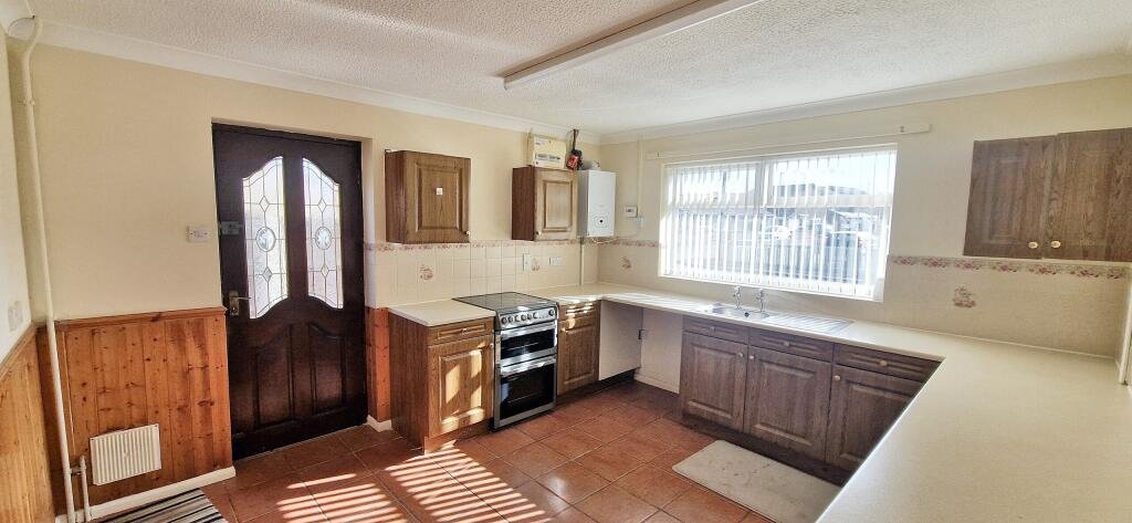 The property is accessed via a front door that opens directly into a spacious kitchen with fitted units and room for appliances.