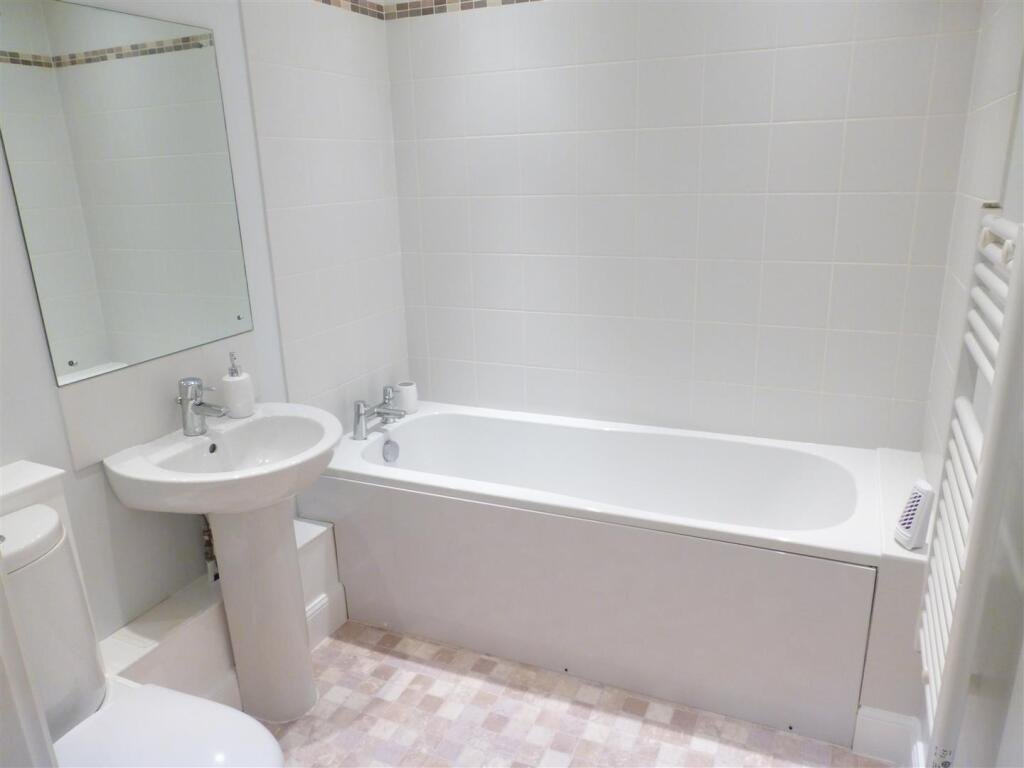 BathroomModern white suite consisting of WC, basin, bath with shower over, heated towel rail, vinyl floor, shaving point, downlights