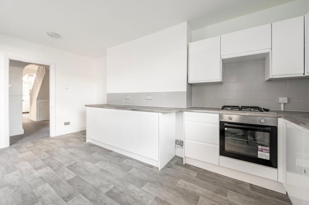 The spacious kitchen includes fitted units, work surfaces, a sink drainer, oven, gas hob, cooker hood and plumbing for both a washing machine and dishwasher. Windows to the rear and side keep the room naturally bright, and a side door provides access out to the garden. A ground floor WCadds further convenience.