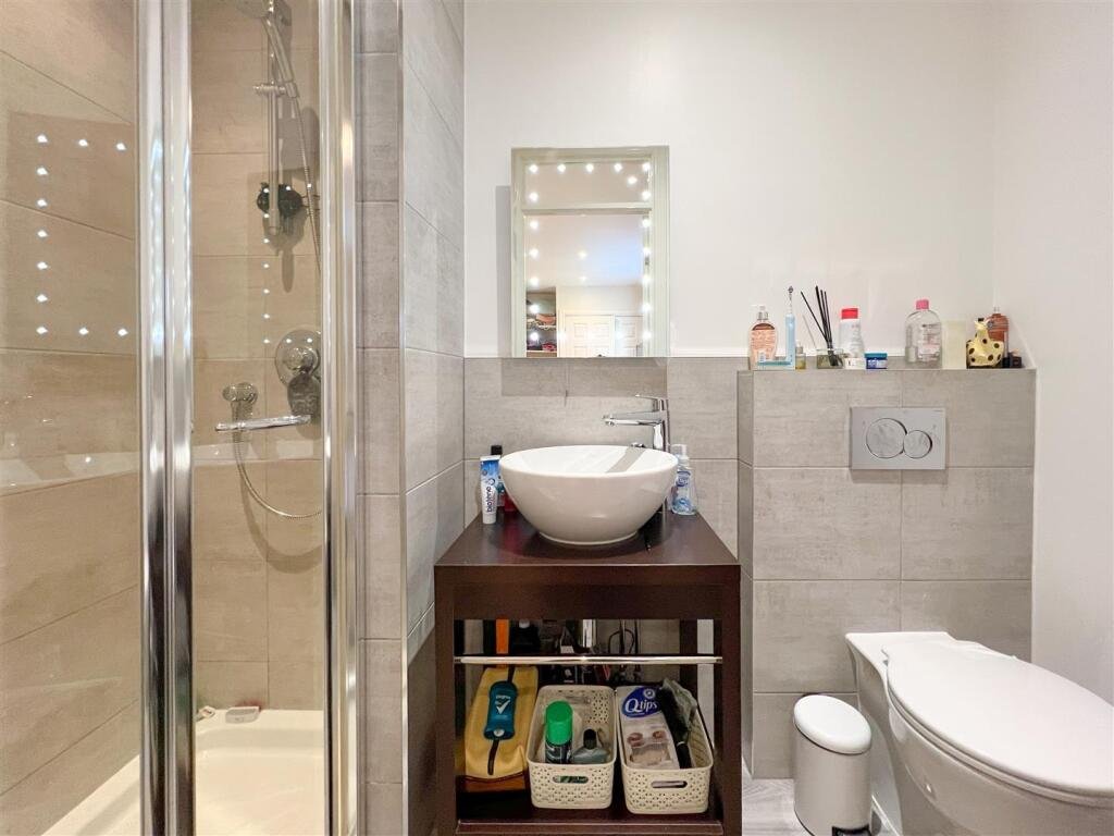 En-Suite – With WC, basin, shower cubicle and heated towel rail.