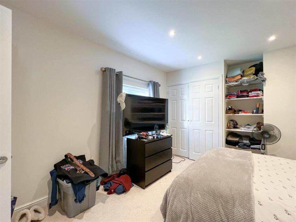 Master Bedroom – 3.85m max x 3.55m max (12’7″ max x 11’7″ max) – Double built in wardrobe and open shelving.