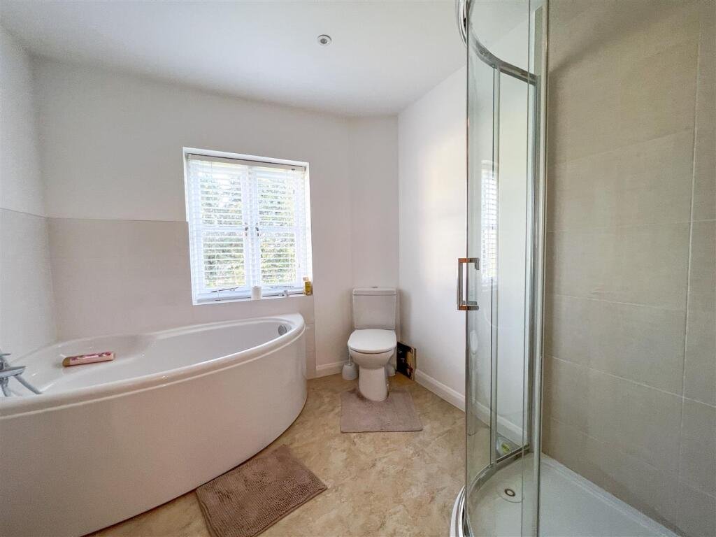 Family Bathroom – With WC, Basin in vanity unit with back lit mirror above, corner bath, separate shower cubicle and heated towel rail.