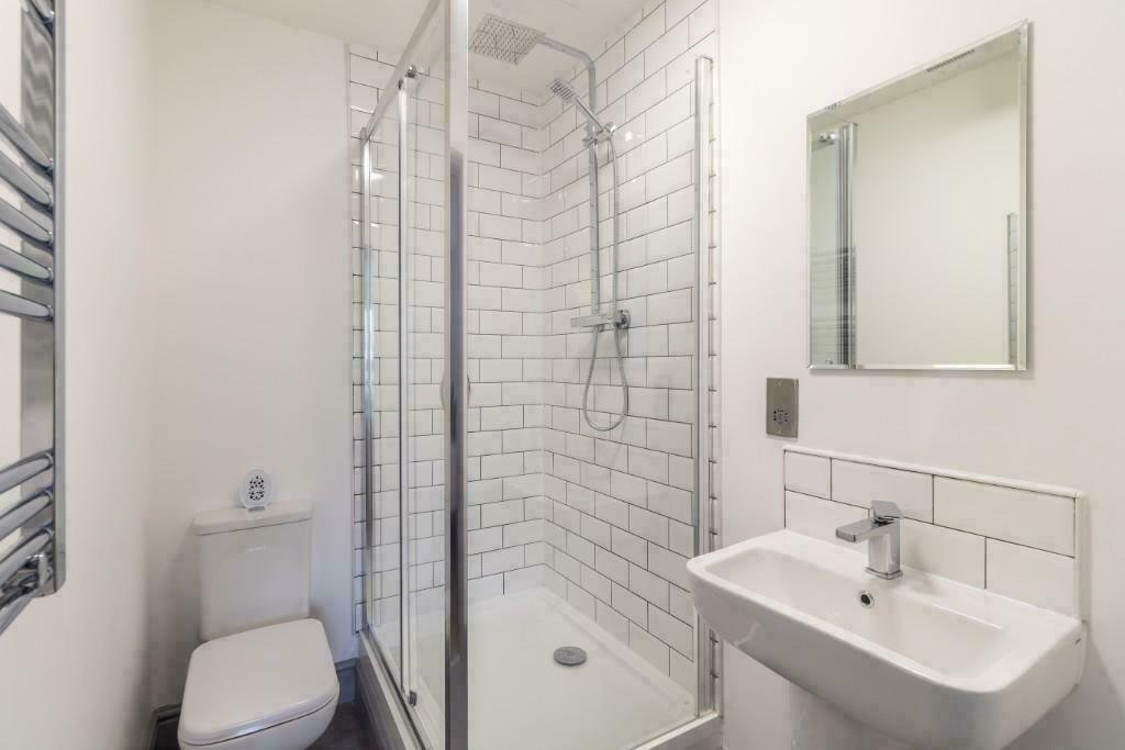 Shower Room: A private shower room with a wash basin, toilet, and heated chrome towel rail for added convenience.