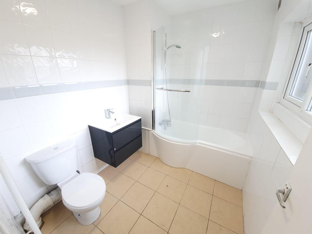 BathroomModern white suite comprising, WC, wash hand basin, bath with shower over. Vinyl flooring and window to