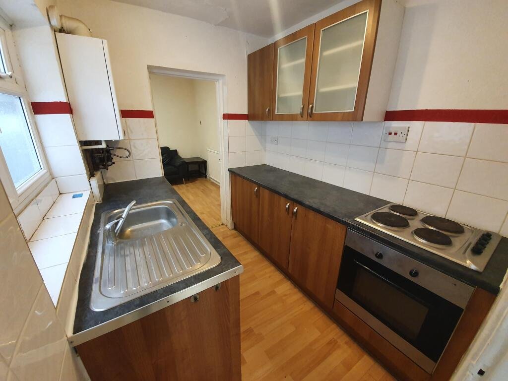 KitchenModern range of wall and base units, electric cooker, fridge-freezer and vinyl flooring, window to the front aspect.
