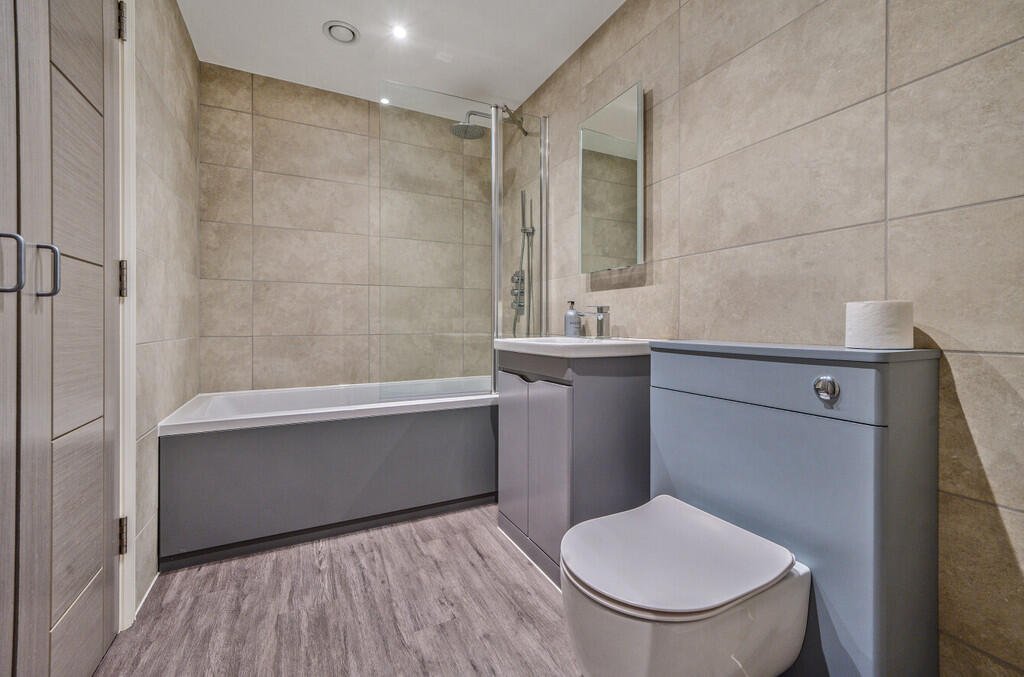 BATHROOM: With a white suite comprising WC, hand wash basin with storage under, panel bath with shower attachment and glass shower screen.Â