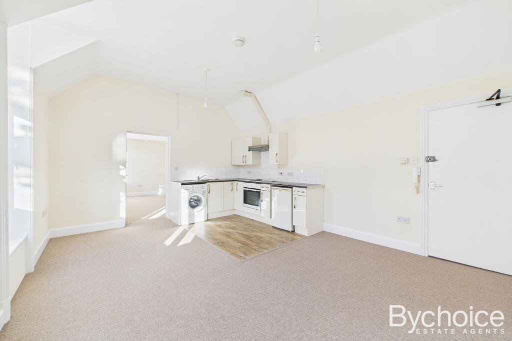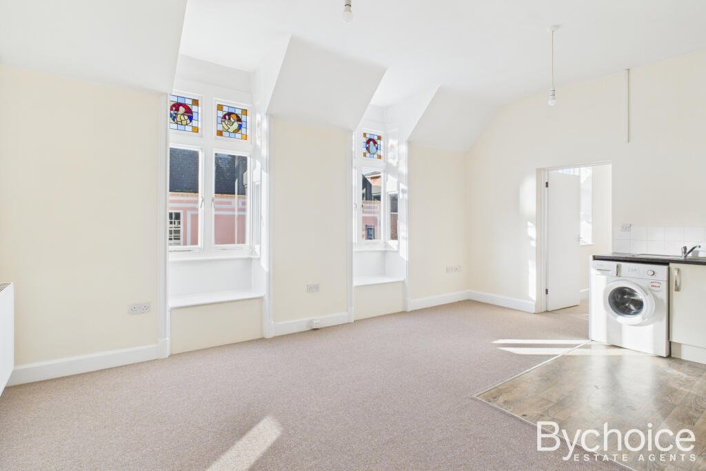 Entered into a spacious open-plan living/kitchen area, the room benefits from high ceilings, fresh neutral décor and distinctive stained-glass upper windows that create an attractive character feature. The kitchen is fitted with oven, hob, washing machine and under-counter fridge, making it ideal for a tenant seeking convenience and practicality.
