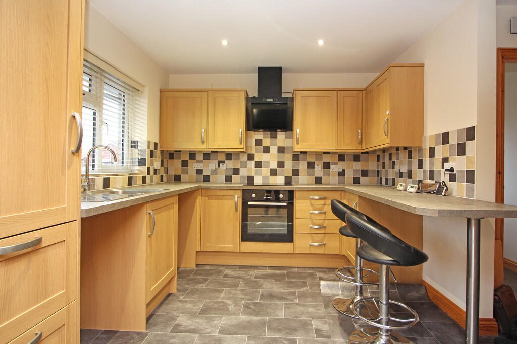 Kitchen 10′ 7″ x 9′ 4″ (3.23m x 2.84m) Double glazed window to front, fitted with a range of matching shaker-style base units and wall cupboards, work surfaces with tiled splash backs, inset single drainer stainless steel sink unit with mixer tap, built-in oven and hob with cooker hood over, breakfast bar, cupboard housing wall mounted gas fired boiler, inset ceiling spotlights, panelled glazed double doors opening into: