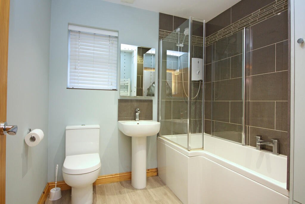 Bathroom 7′ 4″ x 7′ 4″ (2.24m x 2.24m) Matching white suite comprising pedestal wash hand basin with mixer tap and splash back, close coupled WC, panelled shower-bath with fully tiled surround, fitted screen and shower over, double glazed window to side.