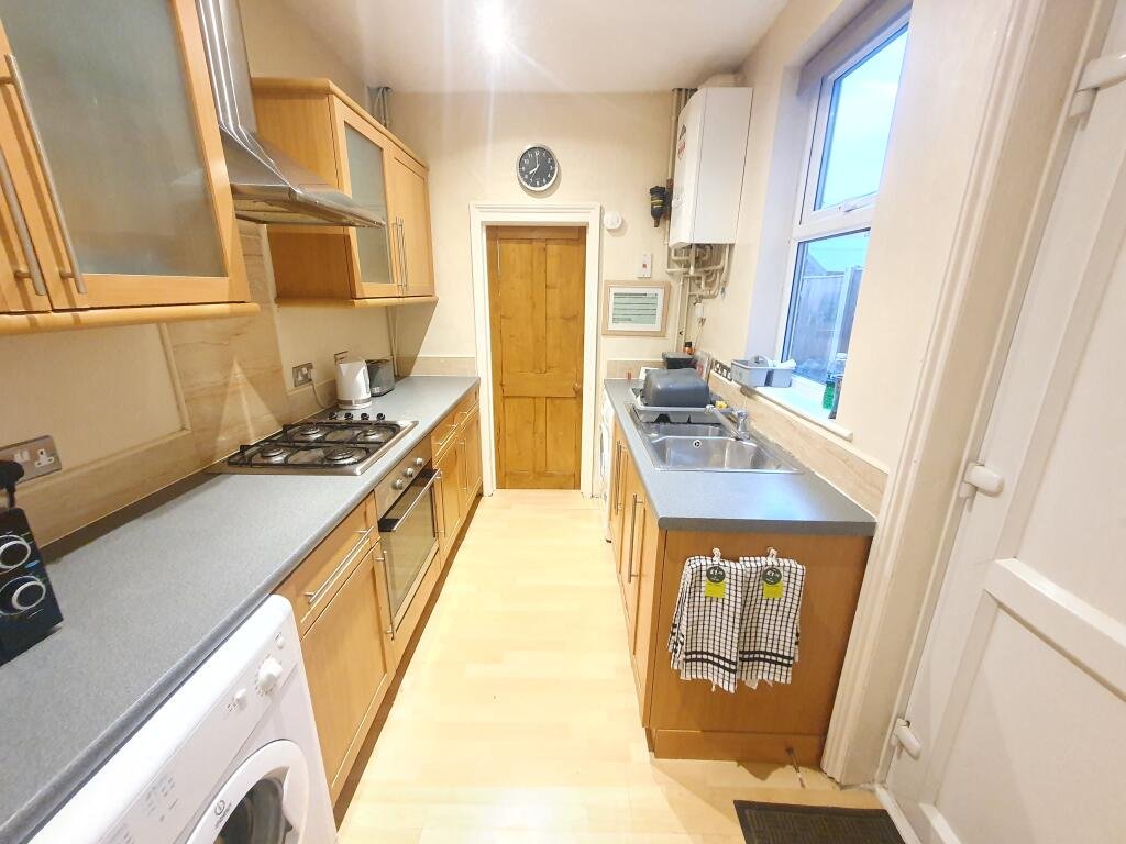 Kitchen Range of wall and base units with Washing Machine, Tumble Dryer, Fridge Freezer, Gas hob & electric cooker with extractor hood over, door and window to side aspect, laminate flooring.