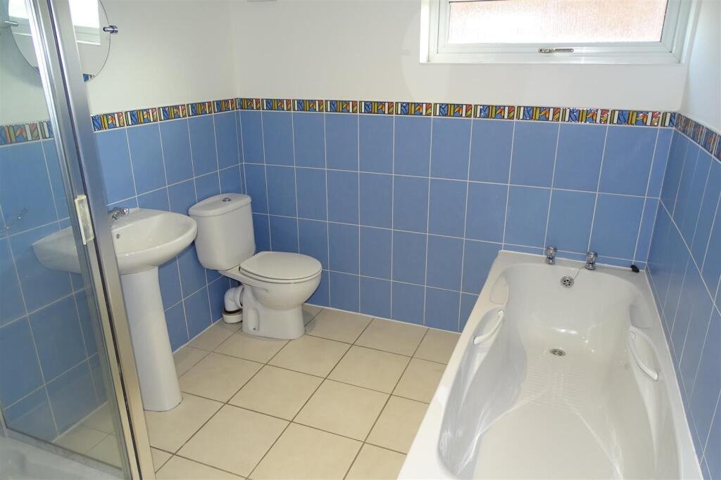 Family Bathroom – Suite comprising w.c.; hand basin; panelled bath; shower cubicle built-in double storage cupboard.