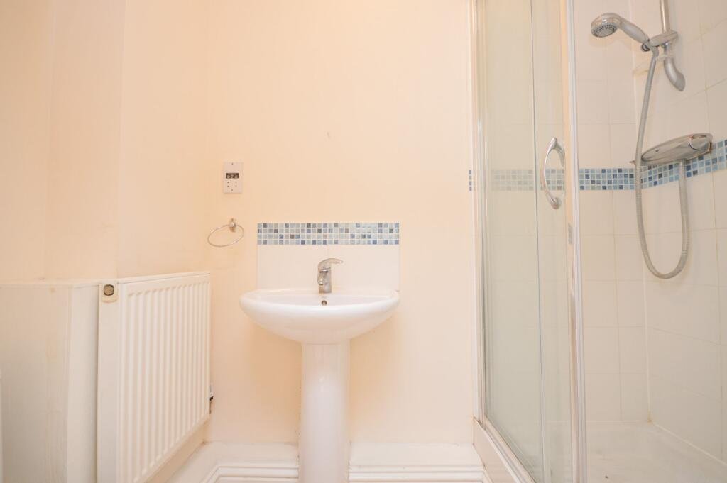 fitted low-level WC with vanity wash hand basin, a mirrored cabinet with built-in lighting. Shower cubicle has screen, rainfall and handheld shower heads, tiling. Karndean flooring and heated towel rail.
