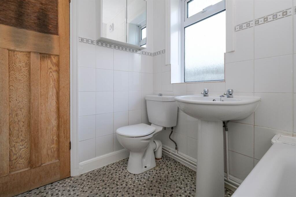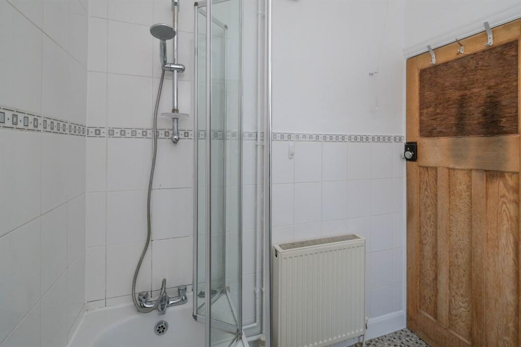 BathroomWhite three-piece suite comprising low-level WC, pedestal wash basin and panelled bath with mains shower over. Tiled walls and radiator.