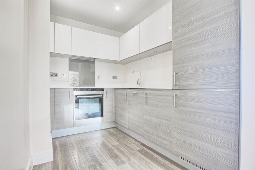 At the end of the hall lies the heart of the home – a bright and spacious open-plan living, dining, and kitchen area. Flooded with natural light from the floor-to-ceiling sliding balcony doors and an additional window, the room features stylish grey wood-effect flooring, recessed spotlights, and plenty of flexible space for lounging and dining. The contemporary kitchen is fitted with glossy white countertops, and textured grey cabinetry, including a dishwasher, fridge/freezer, electric oven, hob, extractor, and a sleek sink with drainer.