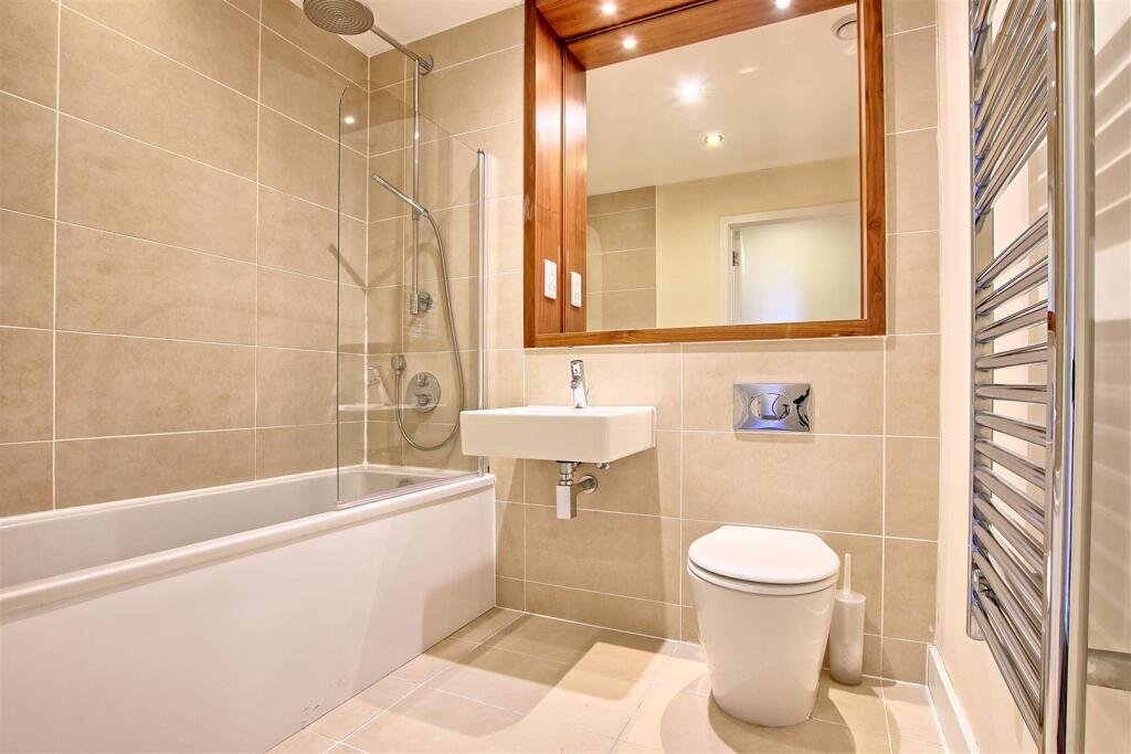 Continuing along the hallway, you will find a large double storage cupboard, offering excellent capacity for household essentials and neatly housing the washing machine. The bathroom is finished in warm beige tiles with chrome details, and comprises a full-size bath with overhead rainfall shower, glass screen, large mirror, wall-hung basin and WC, creating a hotel-style space.