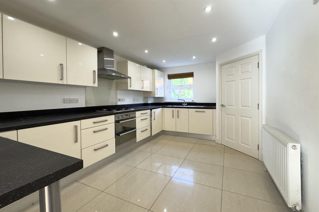 extractor fan, stainless steel sink and drainer, and a range of cream high-gloss base and wall units with chrome handles. Granite-style worktops and beige tiled flooring throughout. Double-glazed window to the front, space for a dining table, radiator with TRV.