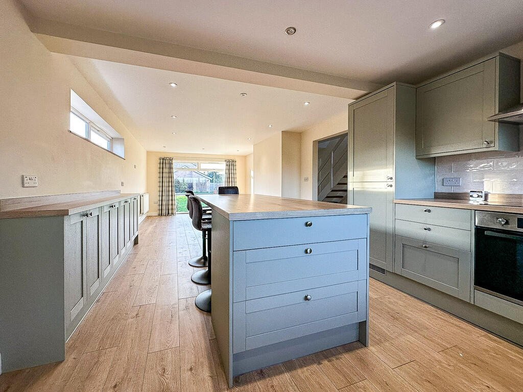 KITCHEN DINING ROOM A large open planned room which has been recently refurbished. With wood effect work surface and feature tiled splash back. There is a central island breakfast bar and stools and one and a half bowl sink with drainer and mixer tap. The kitchen comes with Integrated fridge freezer and dishwasher, electric oven hob and extractor fan over. The room is finished with wood effect laminate flooring and UPVC windows to rear, front and side aspects, there are also sockets with USB charge points. Within this room there is an oak door to the pantry and fuse boards and a door to an additional porch and utility area. Â