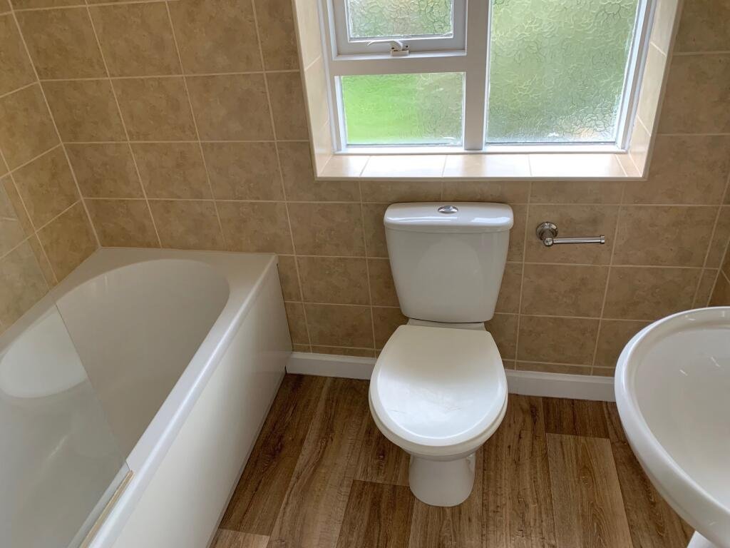 with grey carpets and walls along with neutral coloured walls tiles in the bathroom to compliment the white three piece suite.
