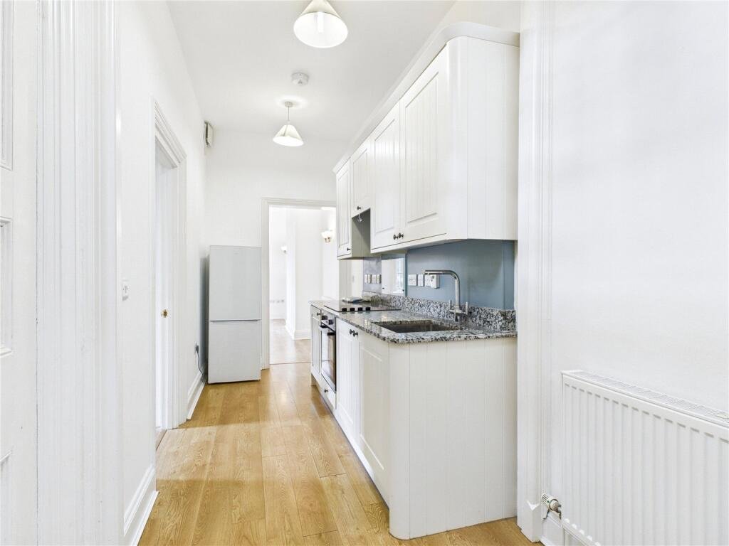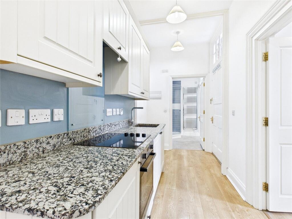 This one bedroom unfurnished maisonette with high ceilings has wooden flooring throughout and comprises: entrance hallway, fitted kitchen with cream shaker style units, stainless steel sink with mixer tap and integrated washer/dryer and fridge, bathroom with separate large curved shower enclosure, heated towel rail and storage, master bedroom and beautiful lounge with double doors leading to patio area. An additional £40 pcm is payable for the supply