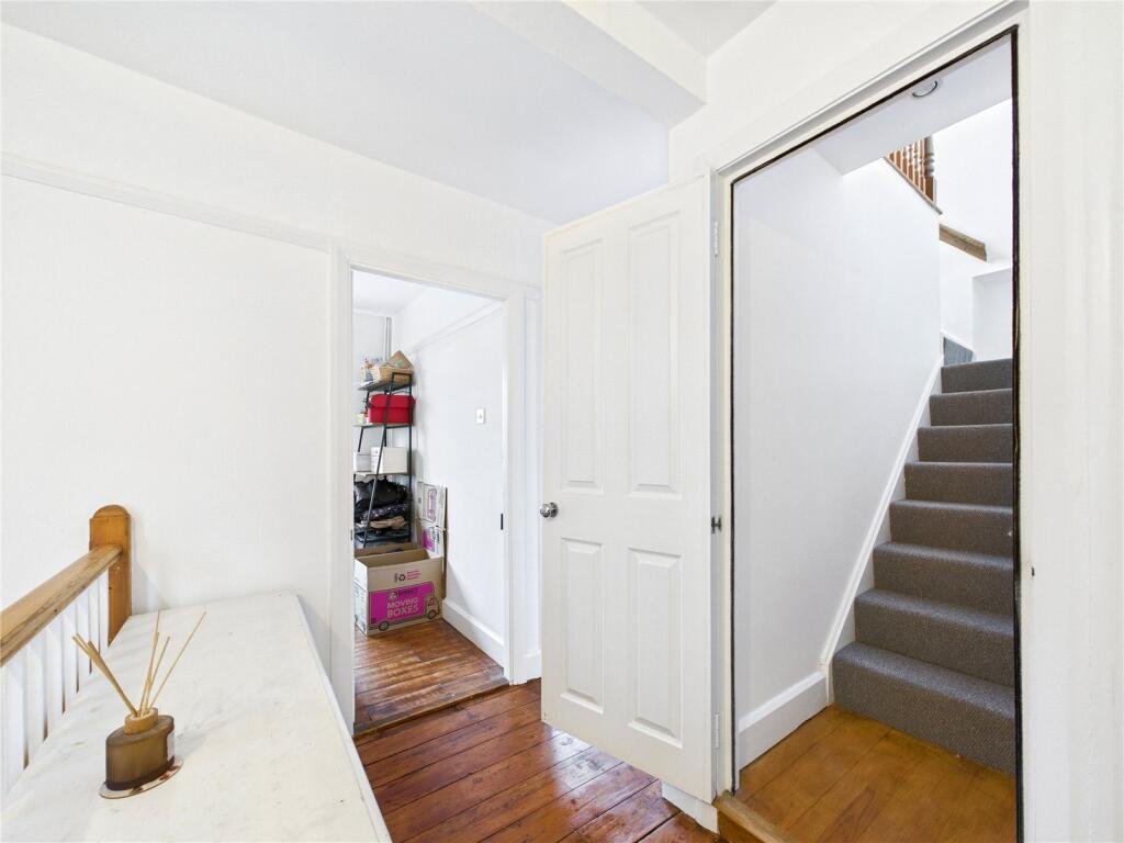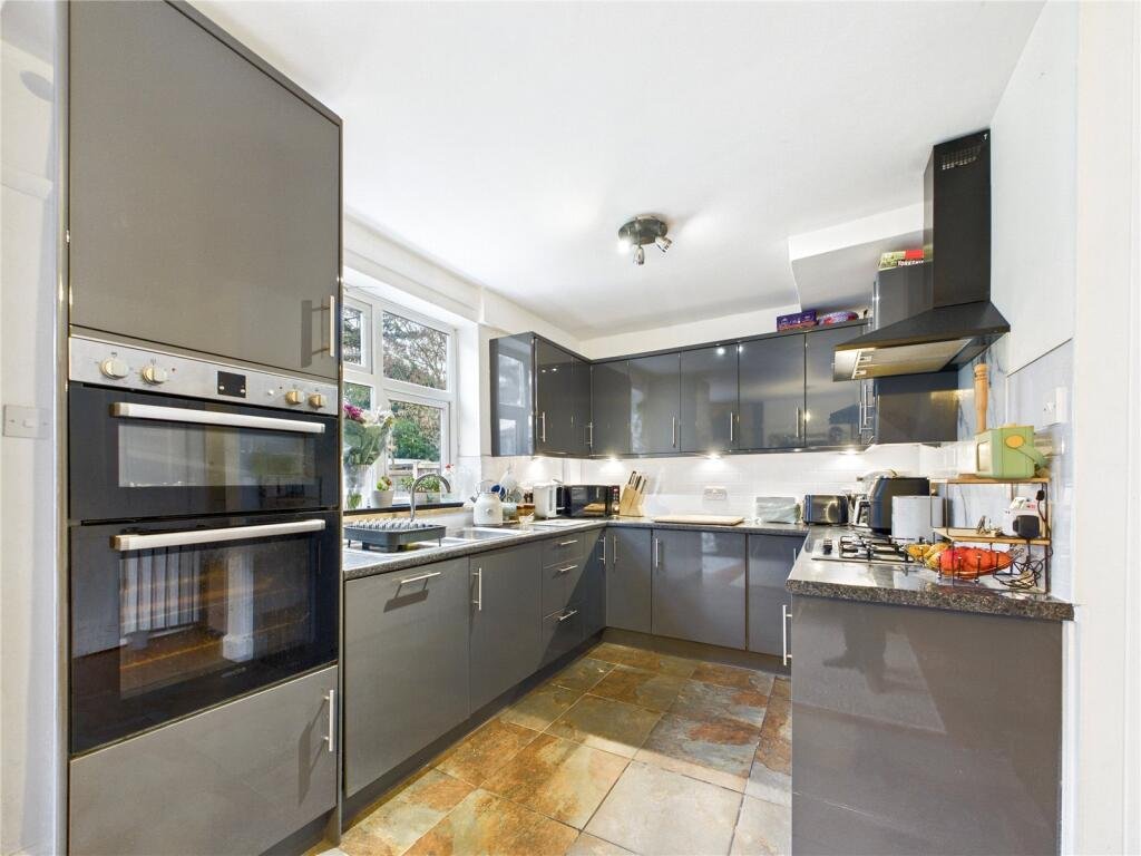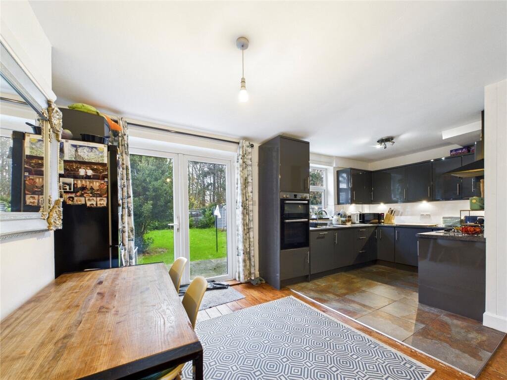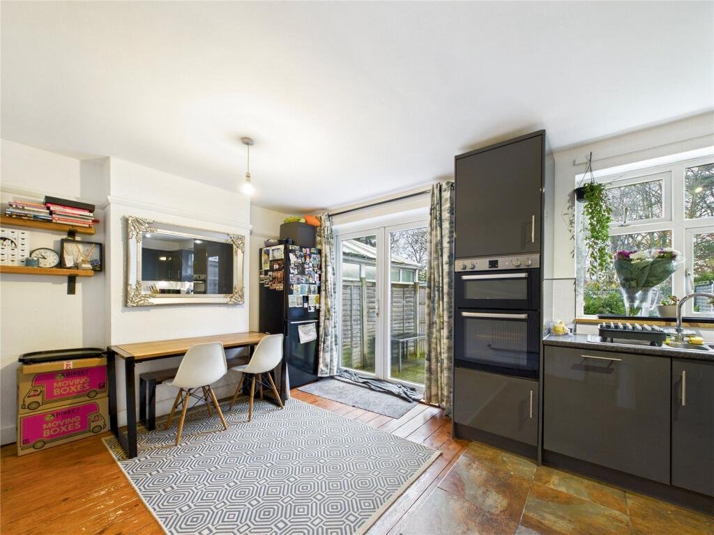 sleek modern grey units including an integrated wall-mounted double oven, integrated fridge and dishwasher, with French-style double doors to the rear garden. There is also an under stairs utility cupboard with plumbing for a washing machine. The first floor offers three bedrooms, two of which are double size and the third a single or ideal study. Off of the landing is a large walk-in wardrobe and a fitted three-piece family bathroom suite including a bath with shower fixture. A doorway to further stairs, leads to the second floor with a secluded bedroom with dual aspect windows.