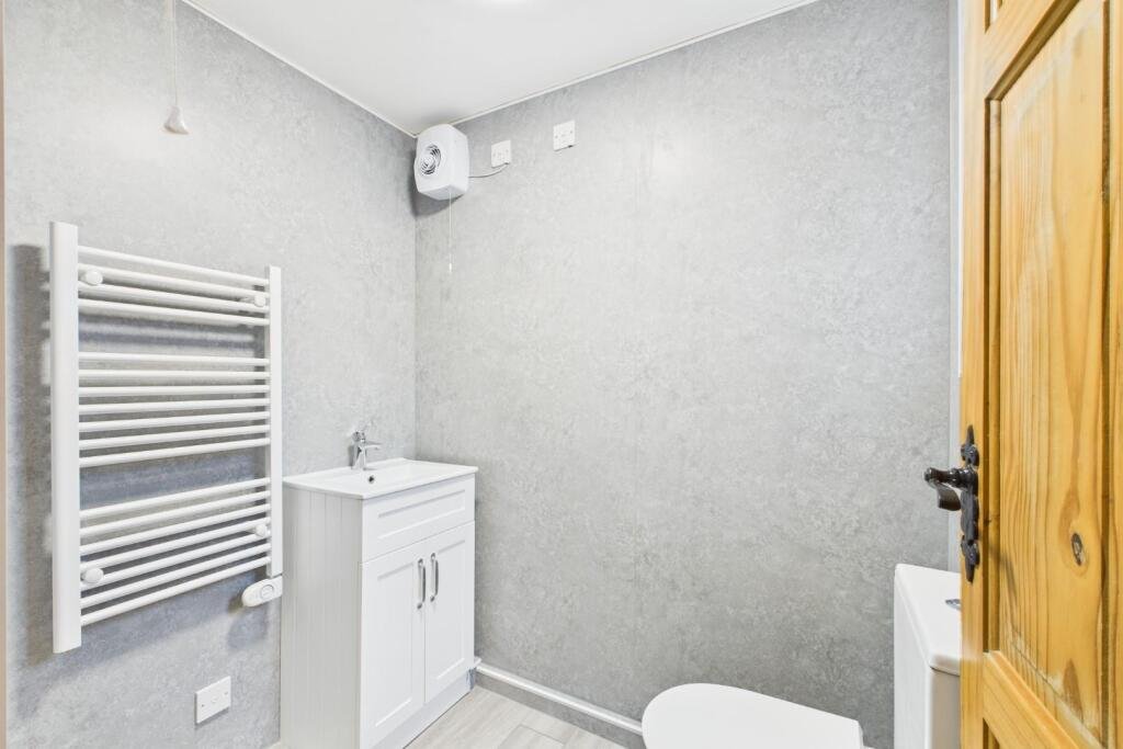 Ground Floor Bathroom – 2.33m x 1.96m – (‘L’ shaped room measured to either extreme, see floorplan). Low level WC, corner wash basin with mixer tap, panelled bath with tiled bath surround and shower over, heated towel rail, wall mounted electric heater, extractor fan, double glazed window to side.