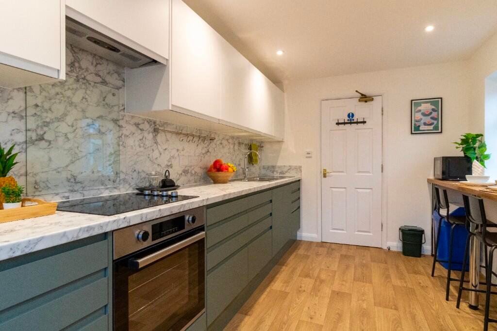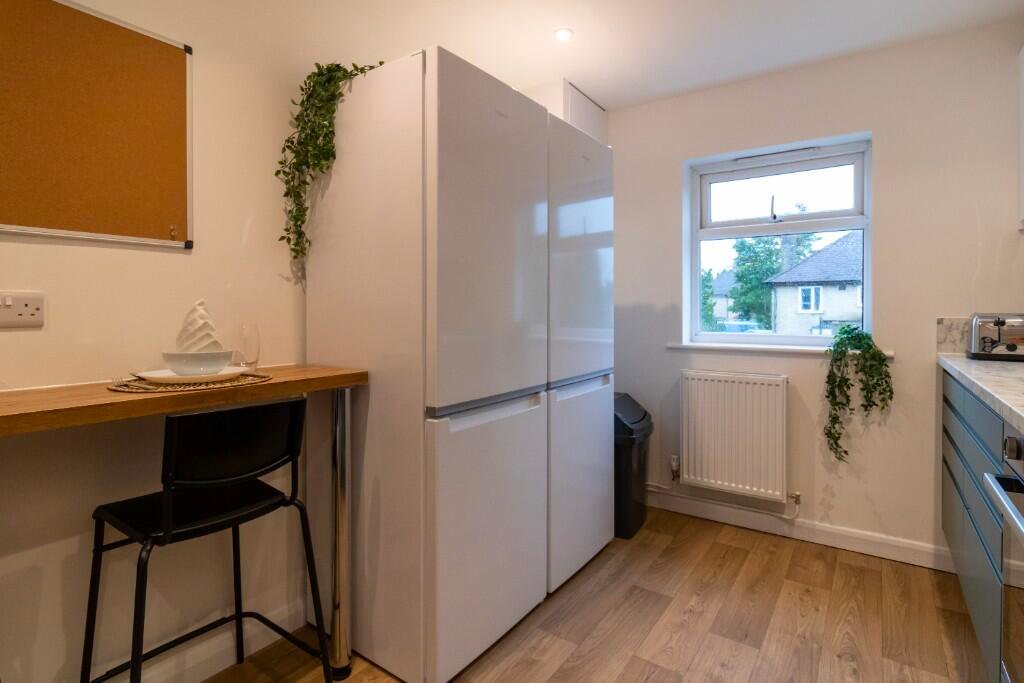 A spacious, well-equipped communal area with new appliances, ample storage, and a tumble dryer included for added convenience.