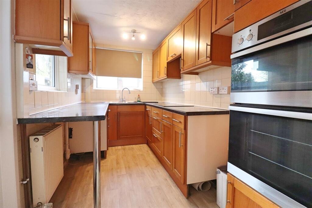 Kitchen – 1.96 x 3.59 (6’5″ x 11’9″) – Comprising of a range of matching wall and base level units with roll edge worktops. Integral eye level oven & grill with separate four ring electric hob and extractor over. Fridge/freezer to remain. Stainless steel sink unit with mixer tap & drainer inset to worktop. Space for appliances. Vinyl tile effect flooring. Windows to side and rear. Tiled walls. Door to garden.