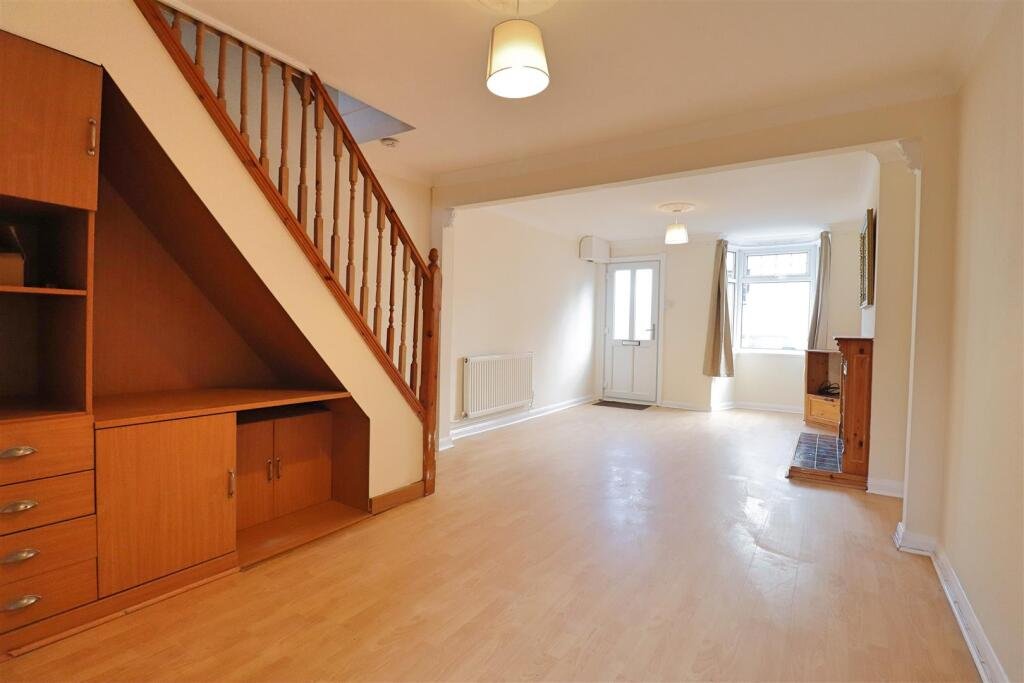 Lounge/Diner – 3.49 x 7.11 (11’5″ x 23’3″) – Laminate wood flooring. Bay window to front and additional window to rear. Two radiators. Stairs