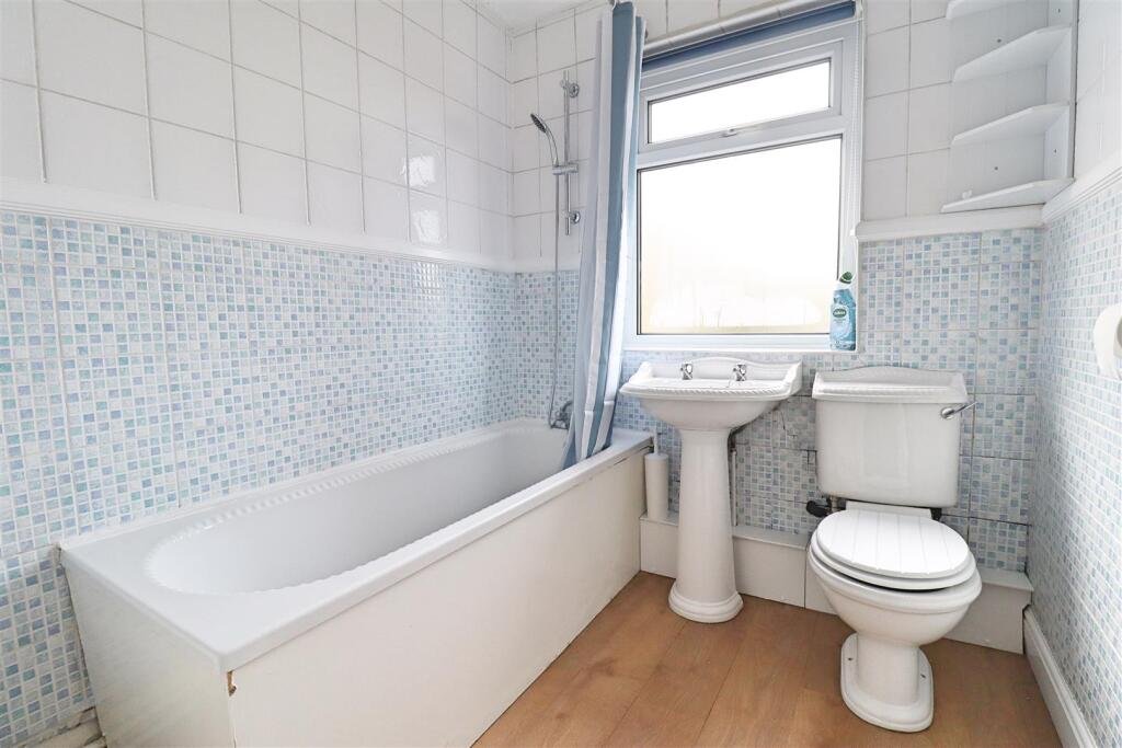 Bathroom – Consisting of a bath with mixer tap & hair attachment, a low level WC and a pedestal wash hand basin. Laminate wood flooring. Obscure glazed window to rear. Radiator. Partly tiled walls. Splashbacks.