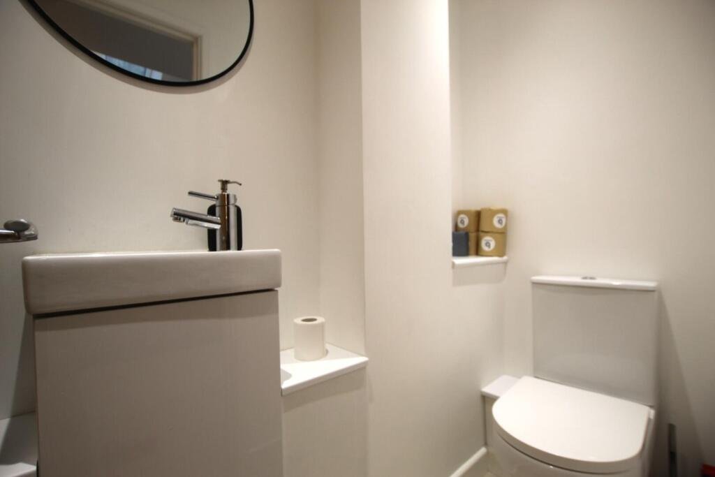 The ground floor features an enclosed living room leading through to a large open-plan dining area and kitchen. The kitchen is modern and well-equipped, complete with built-in appliances including a washing machine, dishwasher and fridge freezer. A convenient downstairs WC is also located just off the kitchen.
