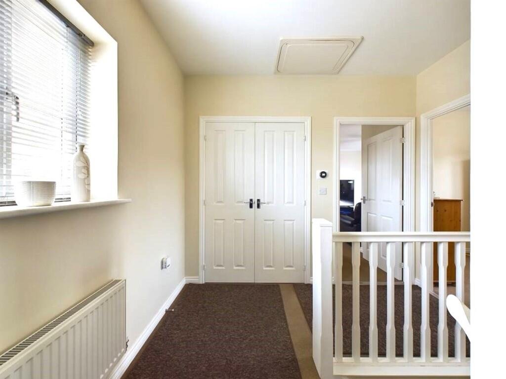 HALLWAY/STAIRS AND LANDING Front entrance door opens to the stairway with an open plan landing at the top (11′ x 9′) and large storage/airing cupboard. Gas fired radiator. Carpeted throughout. Â