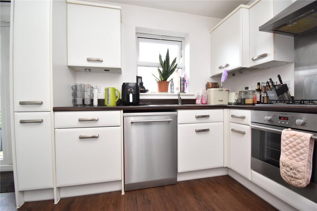 ideal space for storage. There are spaces for a washing machine and tumble dryer. The modern kitchen offers a range of base and eye level units, stainless steel sink with drainer, cooker with four ring gas hob and extractor above, space for a fridge/freezer and dishwasher.