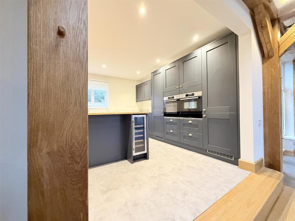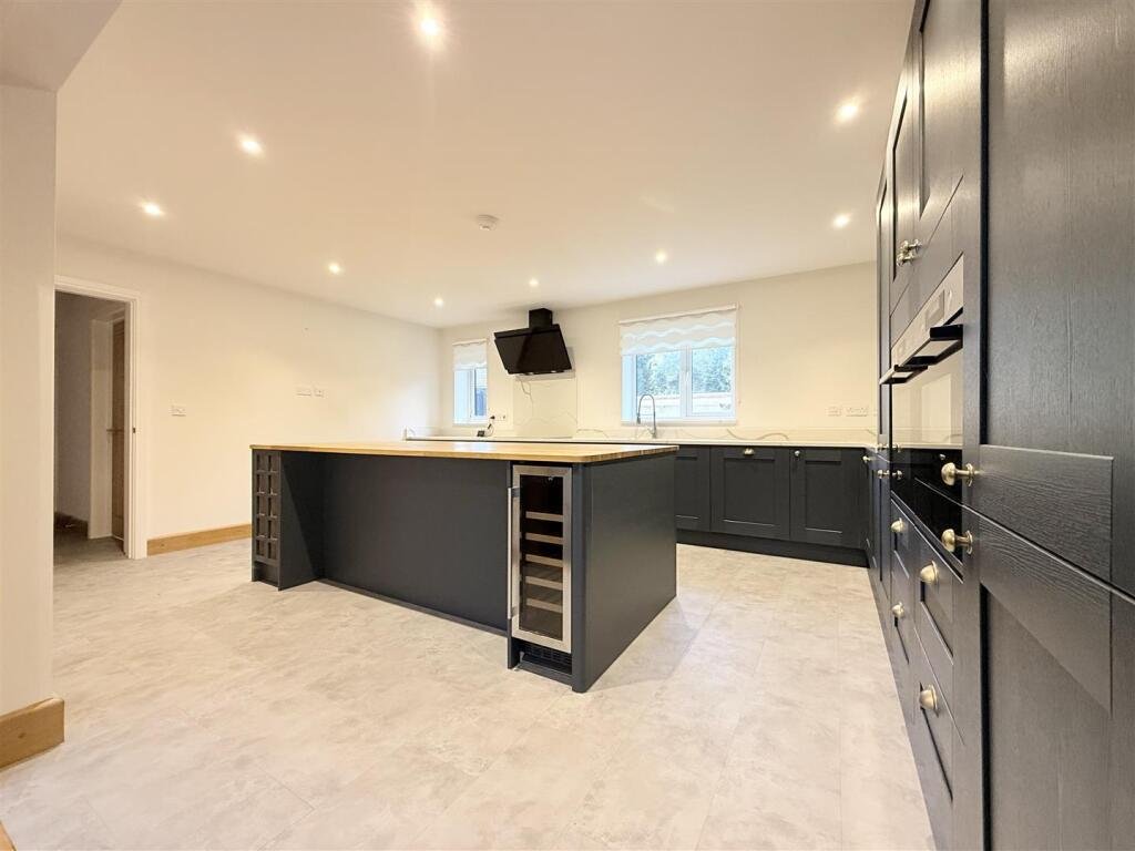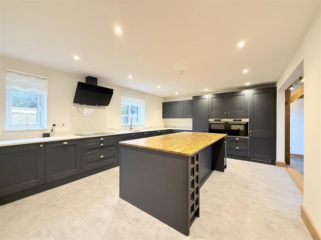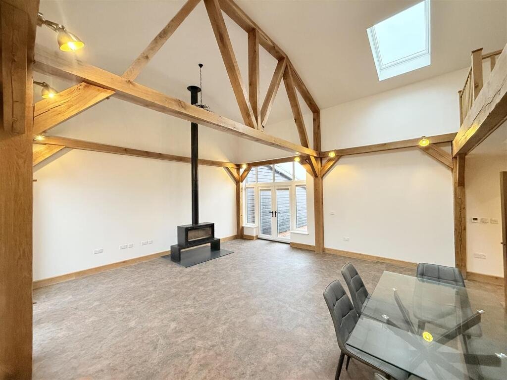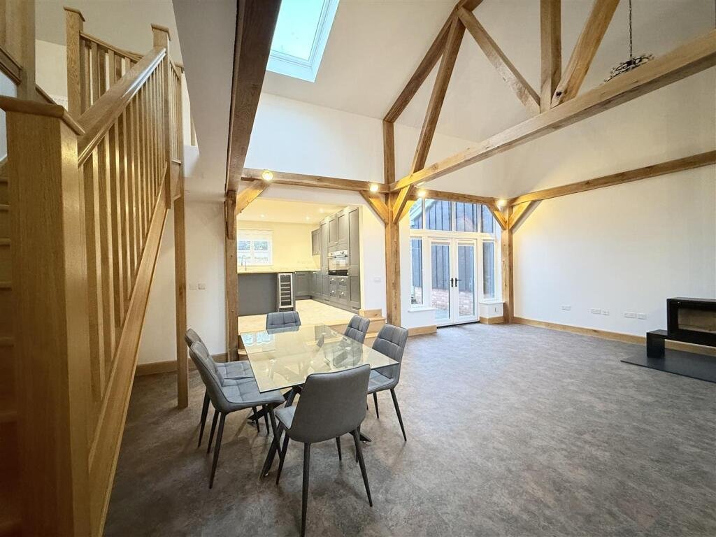 The heart of the home is the bright and spacious open-plan kitchen/dining area, designed with clean lines, sleek finishes and integrated appliances. Statement beams add warmth and character, while French doors open directly onto the garden, allowing natural light to pour in and creating a seamless connection between indoor and outdoor living