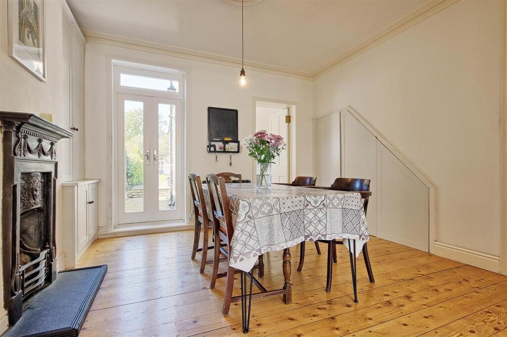 The property is accessed via the footpath made from original tiles which leads to the front door and immediately outside the property there is a paved front garden. Once inside, there is a hallway with stairs leading to the first floor and original moulding to create the curved arch overhead. On the left hand side, there is a doorway leading into the dining room which is open with the living room at the front of the property. The dining room has an original cast iron fireplace, a built-in tall cupboard and French doors leading to the rear garden. The space is large enough to seat 6 – 8 people at a dining table. The dining and living room have been opened up to create an open plan space with the living room overlooking the front of the property. The room is flooded with light thanks to the large bay window and also enjoys an original fireplace. At the rear of the property is the kitchen and bathroom. The kitchen is a galley style with white shaker style units and a light coloured worktop, set off by white metro tiles on the walls. Within the kitchen there is a butler sink, freestanding range style oven with hob, integrated dishwasher and full height SMEG fridge freezer. The bathroom is positioned at the back of the property and has a bath with dual head rain shower, basin with under cupboard storage and W.C.