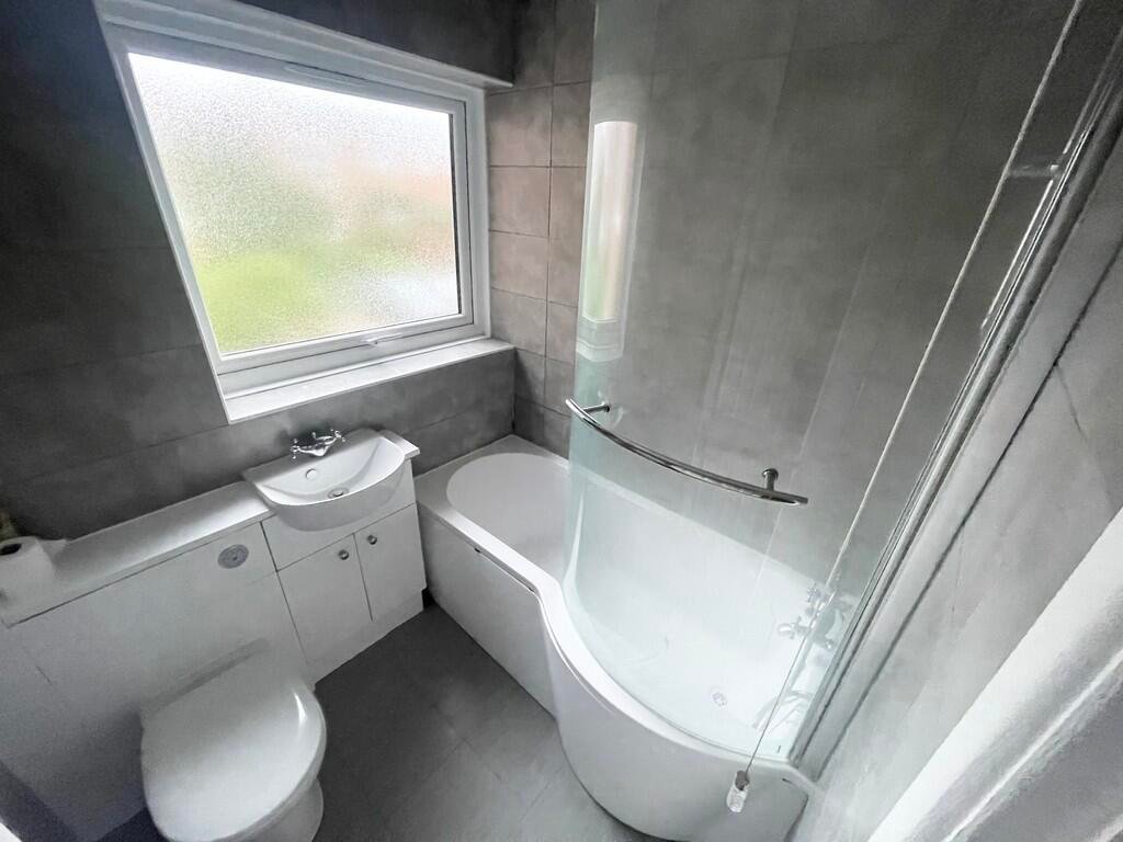 BATHROOM 6′ 1″ x 5′ 5″ (1.85m x 1.65m) Double glazed uPVC window. White suite comprises p-shaped, curved glass bath side screen. White vanity unit with recessed wash hand basin and WC. Ladder style radiator. Â