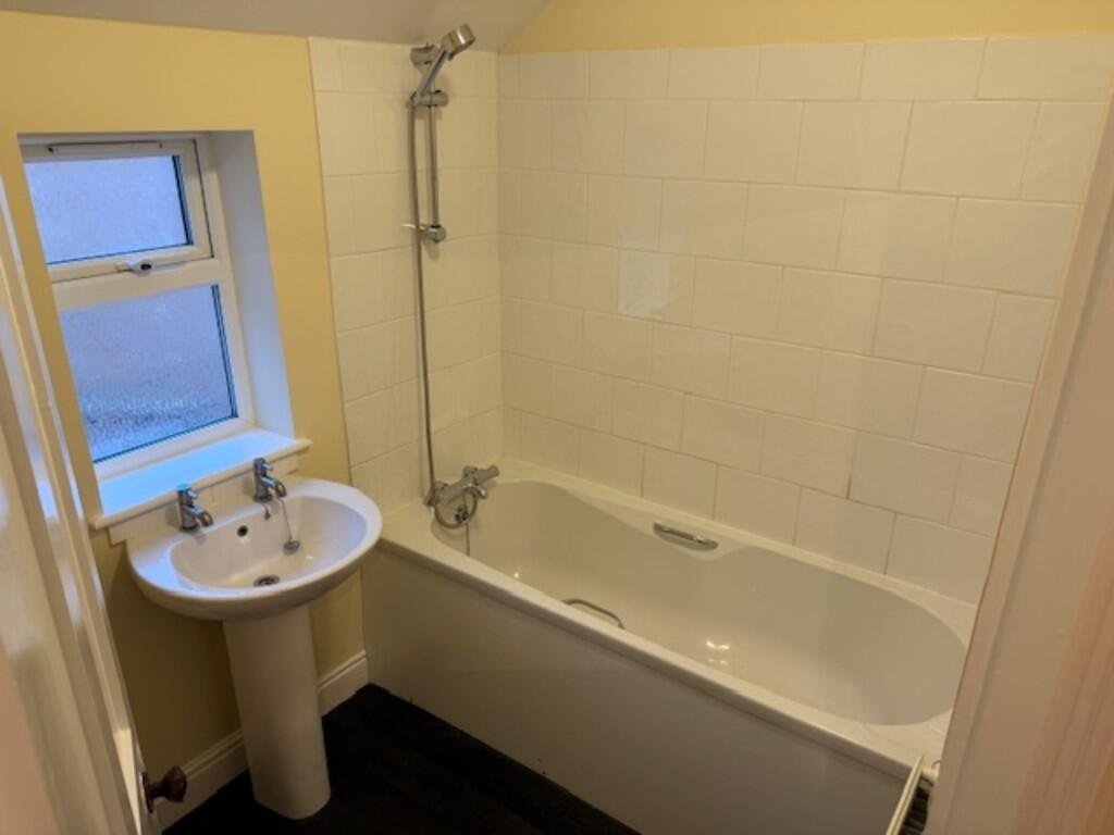 BATHROOM White bathroom suite fitted with toilet, sink and bath with shower over. Double glazed window fitted with radiator to wall