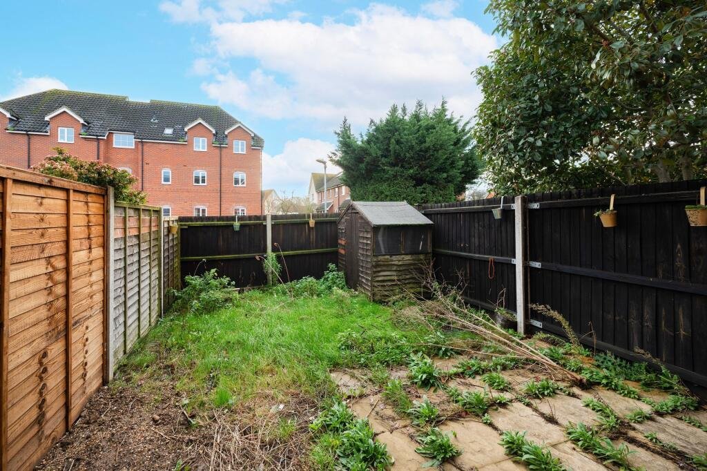 Outside, the enclosed rear garden offers a terrace, lawn and hardstanding space suitable for a garden shed. The property also benefits from one allocated parking space, with further visitor parking available.