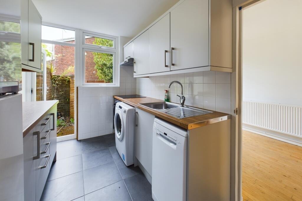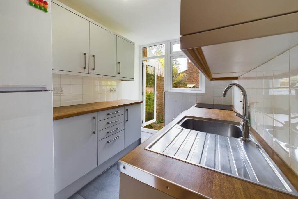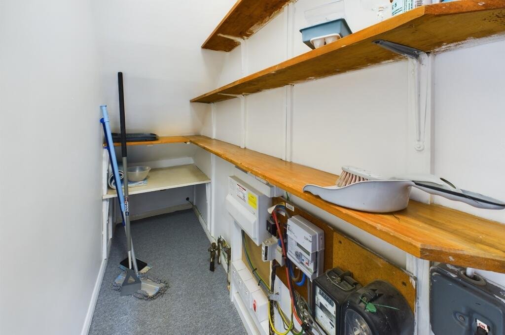 Fitted kitchen with light grey wall and base units, roll top work surfaces and tiled splash backs, stainless steel sink unit and drainer with mixer tap, space and plumbing for washing machine, space and plumbing for slim line dishwasher, built in induction hob with extractor hood over and electric oven below, space for fridge/freezer, pine louver doors to large walk in under stairs cupboard with shelving, lighting and coat hooks.