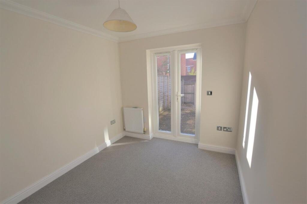 Bedroom – 2.54m x 2.79m – Fitted carpet, radiator and UPVC French doors to garden. Built in cupboards.