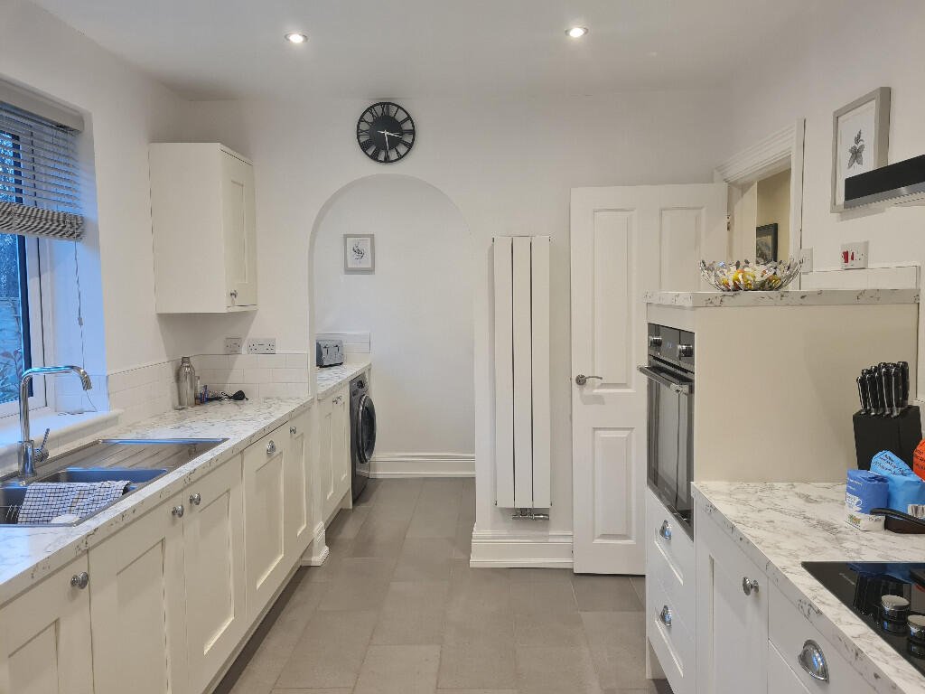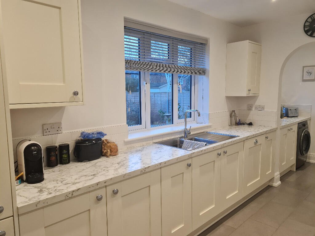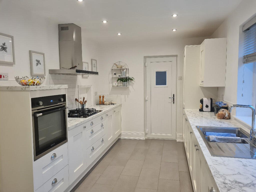 Kitchen: White shaker style kitchen units with grey/white marble effect worktop and white tiled splashbacks. Grey tile flooring and venetian blind to window. Stainless steel 1.5 sink with drainer and chrome mixer tap. Integrated Electra fridge/freezer, Baumatic dishwasher, Hoover oven, gas hob and stainless steel extractor hood. Side door leading to the garden.