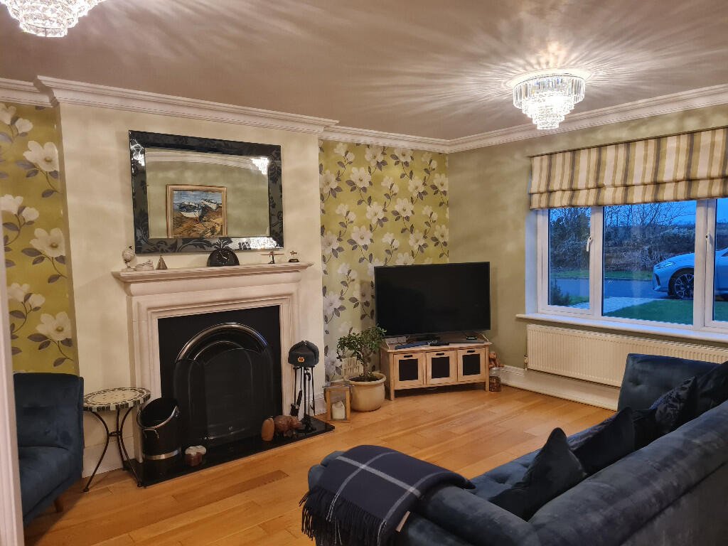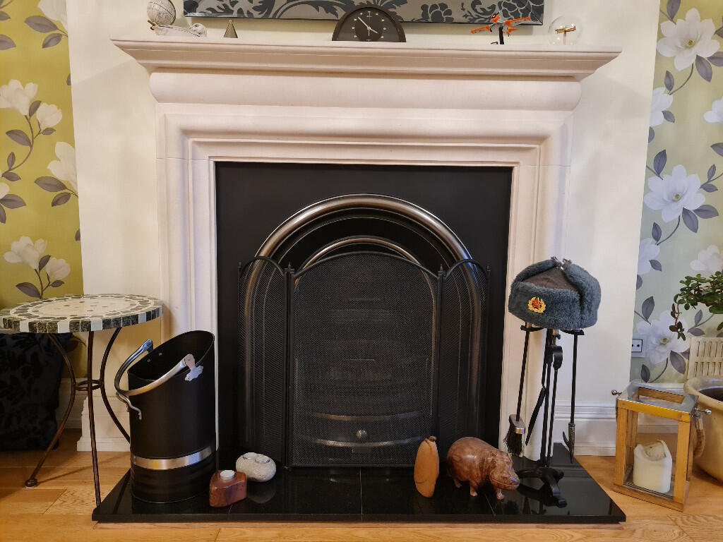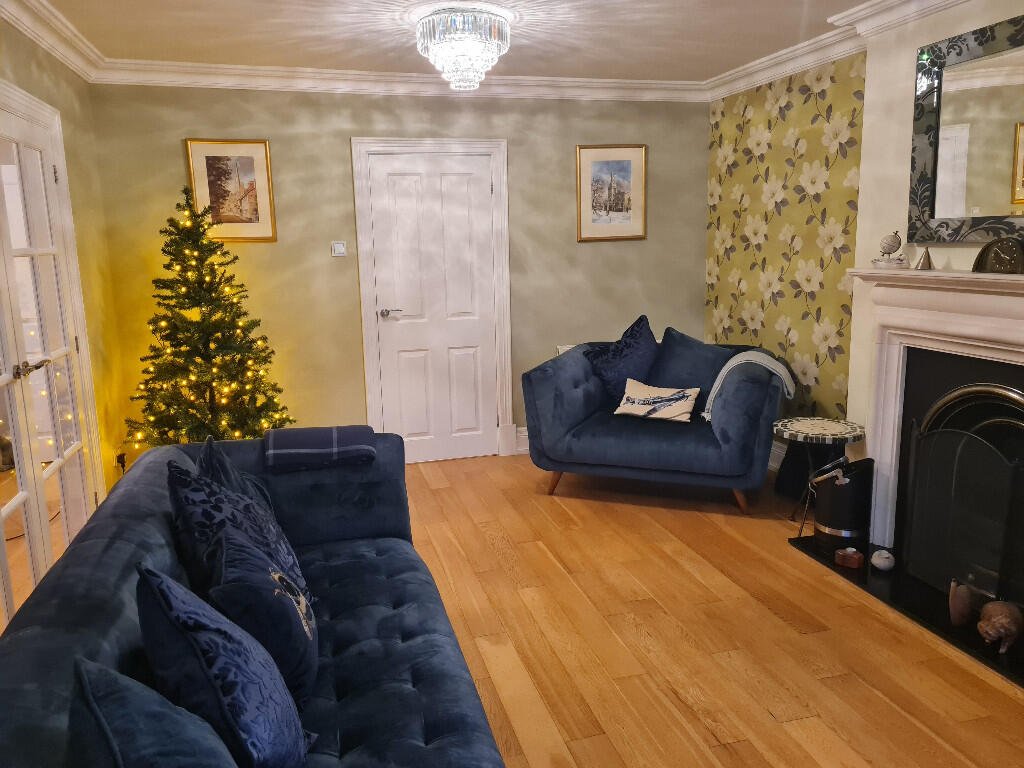 Lounge: Feature fireplace with working duel coal/wood burner, sage green walls with a feature papered wall. Engineered oak flooring, striped
