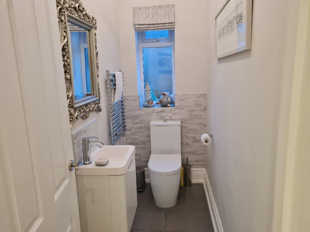 Cloakroom: Grey walls with marble effect tiles, white close coupled toilet with push flush, vanity mounted basin with chrome mixer tap, chrome heated towel rail, toilet roll holder, grey roman blind and grey floor tiles.